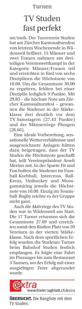 Am 19. September wurde der Jugi Studen nachträglich die Goldmedaille vom Seeländischen Jugendturntag in Grossaffoltern übergeben. Da bei der
