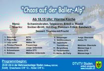 Dieses Jahr wird die Turnerfamilie in den Schneebergen sein. Unter dem Motto, "Chaos auf der Baller-Alp" soll die Falschzahlung vom letzten Jahr aufgeklärt werden. Nach der Aufführung kann sich das Publikum im Saal, in der grossen „Römerbar“ oder „Oldiebar“ mit Menschen aus unserem Dorf treffen.