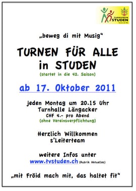 Am Montag 17. Oktober 2011 beginnt nach den Herbstferien wieder das Turnen für Alle. Unter der Leitung von Rolf Angele können Frauen und Männer ab 16 Jahren ihre Fitness trainieren und dem "Winterspeck" vorbeugen. Es besteht keine Verpflichtung in den Turnverein bei zu treten. Es sind alle herzlich willkommen. Pro Abend kostet das Mitturnen CHF 4.-