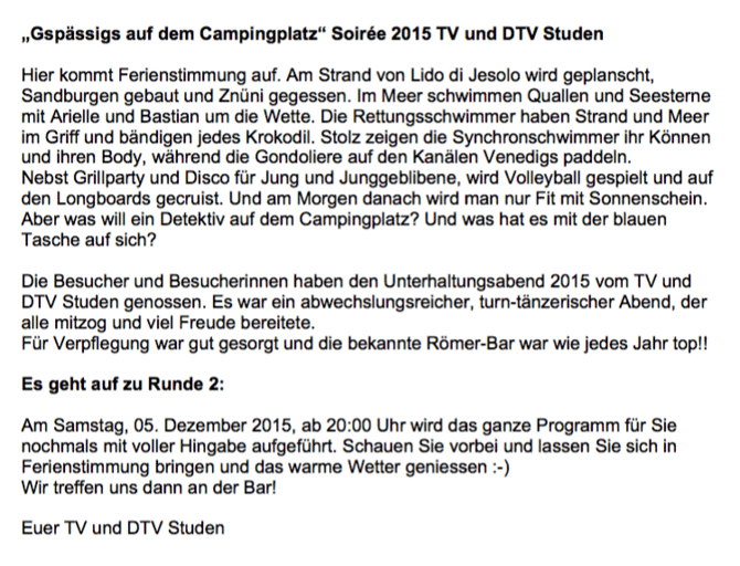 Im Namen vom Turnverein Studen danken wir Arseli Merino für das Erstellen der Web- und der Facebookseite vom TV Studen. Auch das Aktualisieren hat Arsi mehrere Jahre ohne das vakante Amt als Presse und Propaganda ausgeführt.